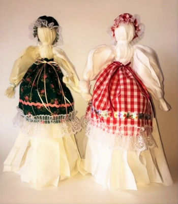 Rag dolls were introduced during the American Colonial period. They were made with leftover or scrap cloth fabric for the body, dress and apron. Lace, string and yarn were also used for the trim or hair. Our rag dolls are made in the same manner, therefore they are all different. You may select a color scheme or style of fabric but all photos are representative, therefore the doll you receive may not be exactly as the photo.